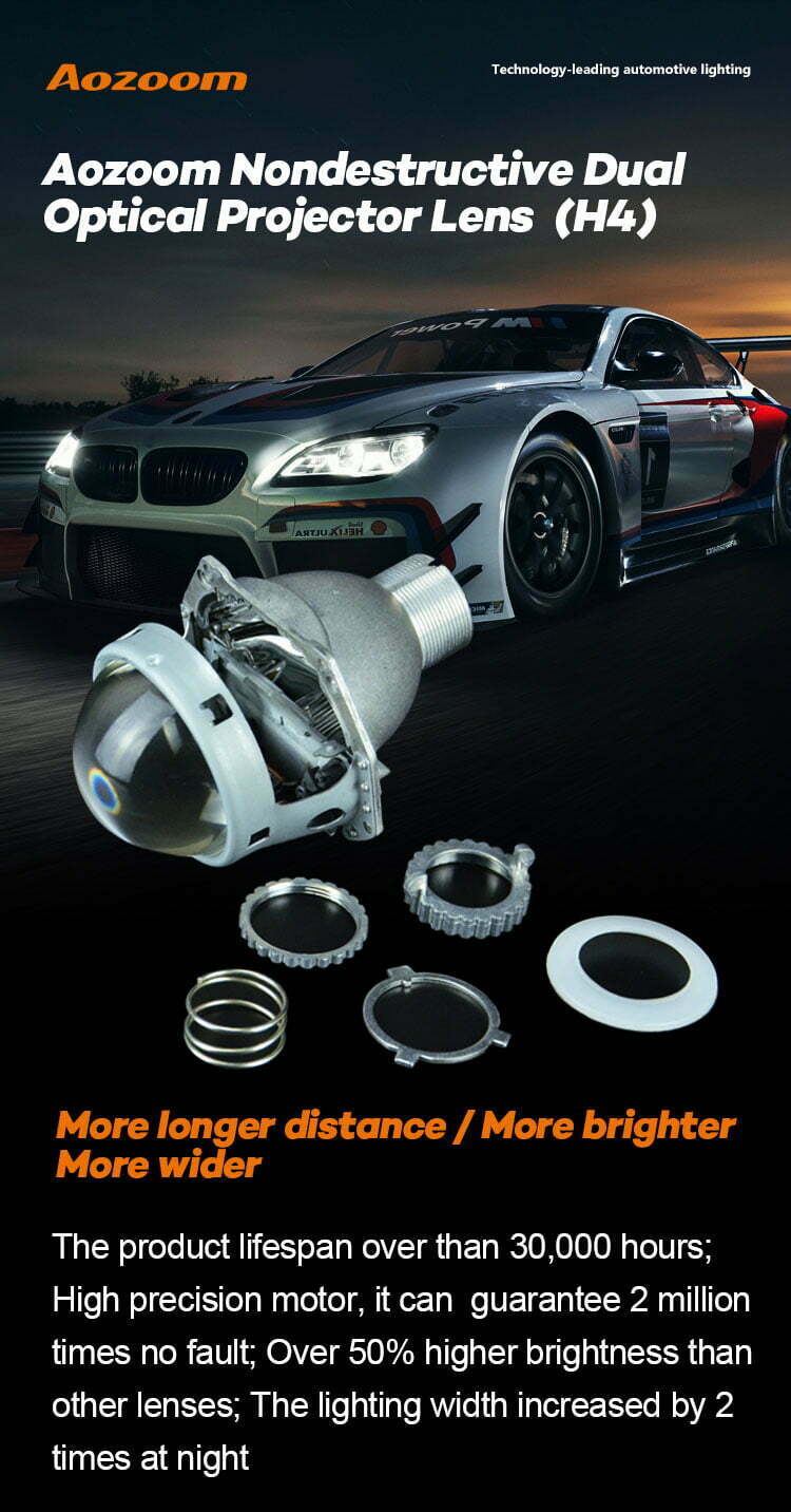 The Aozoom D2S bi-xenon-projector lens is made for aftermarket retrofit to have the performance of OEM headlights. Essentially, it is the upgraded version of the Hella 5G projector, which is the most widely used original equipment projector in the world, such as the projector on E55. The high beam of the E55 projector is outstanding cause Hella 5G sacrifices the low beam hotspot to for having a high beam that penetrates for hundreds of yards. But, when Aozoom D2S was released, it changes the thing. This projector inherits the outstanding high beam of Hella 5G and enhances the low beam pattern, which produces a very wide beam pattern with a perfect distribution of light and tops it off with a supremely sharp cutoff and strong hotspot that will blow your mind.