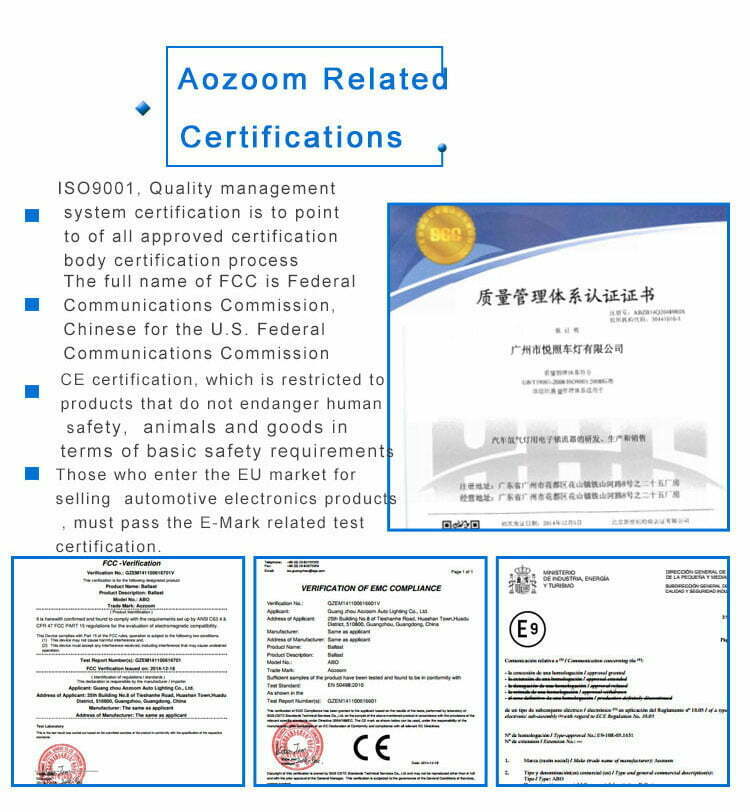 Located in Guangzhou, China, Aozoom is a Hi-tech enterprise for automobile lighting products manufacture with integrated development, production and sales. Our main products are digital HID xenon Ballast, HID xenon bulbs, HID bi-xenon projectors, LED projectors, LED interior and exterior lights.